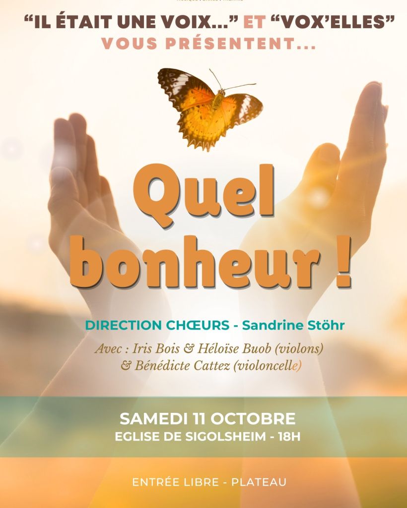 Nos chorales « Il était une voix… » et « Vox’Elles » vous présentent leur concert « Quel bonheur ! » sous la direction de Sandrine Stöhr.